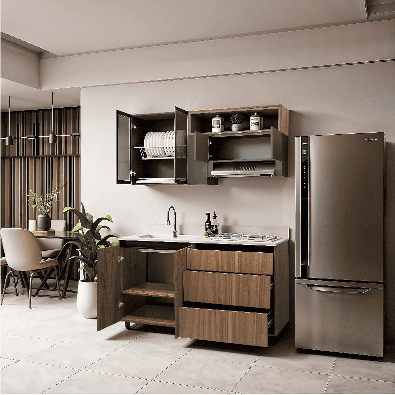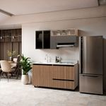 La Cocina Integral Industrial destaca por su diseño moderno y sofisticado, ideal para ambientes contemporáneos. Fabricada en aglomerado RH y acabada en tonos madera y antracita, combina estilo con alta durabilidad. Su sistema de apertura tipo gola metálica aporta un look minimalista y elegante.