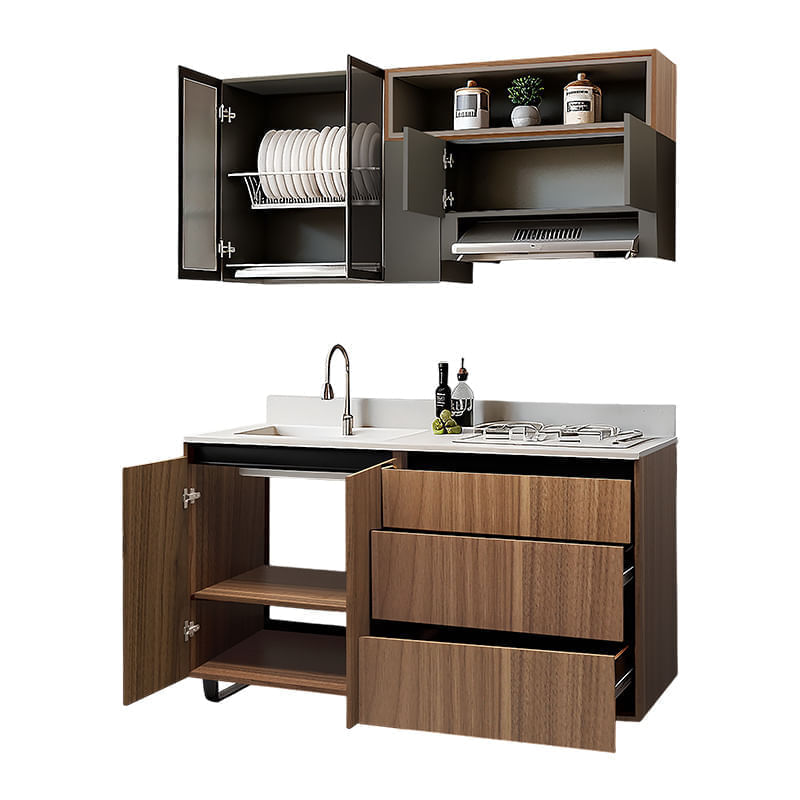 Los módulos superiores e inferiores ofrecen gran versatilidad: pueden configurarse con espacios para electrodomésticos como horno o microondas, o instalarse con puertas si se prefiere mayor almacenamiento cerrado.