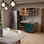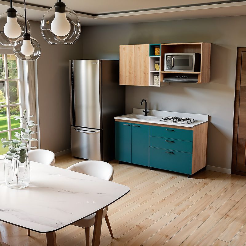 Remodela tu hogar la Cocina Integral Intensa con diseño innovador que combina tonalidades verdes contemporáneas con la calidez de la madera. Fabricada en tablero melamínico de alta resistencia a la humedad (RH), garantiza un espacio libre de hongos y moho, con una superficie resistente a rayones y al uso intenso. Armado de fábrica con ensamble invisible (sin tornillos a la vista) y un sistema modular que facilita la instalación. Cada detalle está pensado para la durabilidad y seguridad: cantos sellados por todos los lados para proteger contra la humedad, bordes frontales suavizados y herrajes de cierre lento en cajones y puertas. Con un sistema de apertura ergonómico que combina pestañas y manijas, esta cocina es la unión perfecta entre funcionalidad avanzada y estética vanguardista.