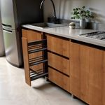 Cuenta con puertas de cierre lento, cajones con rieles de extensión total, condimentero en aluminio negro y sistema de apertura con cañoleta, que facilitan el uso diario. Además, incorpora patas de acero de alta resistencia, que brindan estabilidad y un toque contemporáneo.