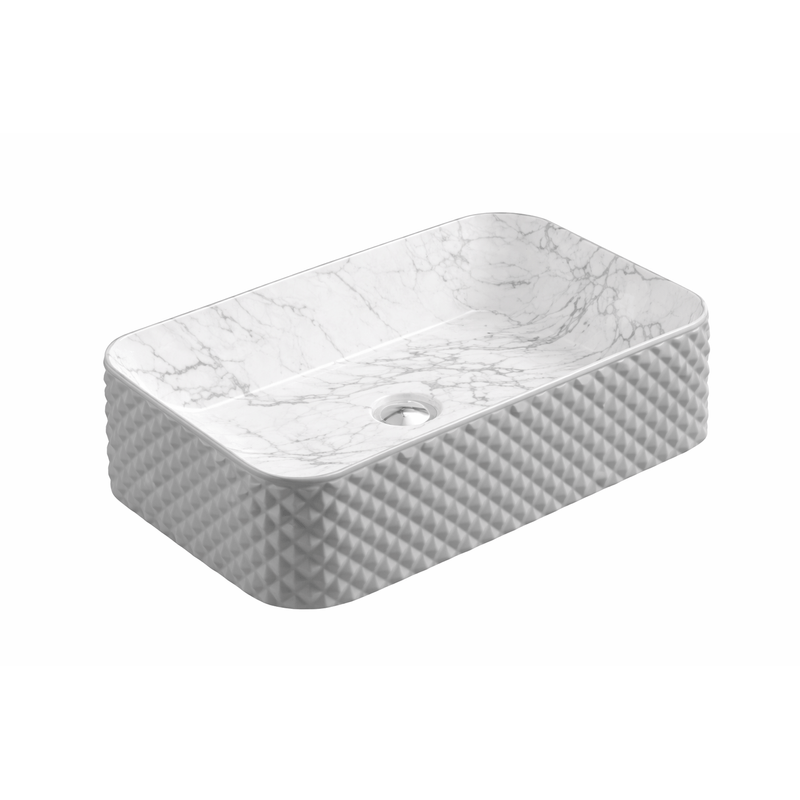 El lavamanos de sobreponer rectangular Stella Gris-Calacatta combina un diseño moderno con un acabado inspirado en la piedra, logrando una estética sofisticada y decorativa. La mezcla de tonos grises con vetas tipo calacatta aporta profundidad y elegancia, convirtiéndolo en un elemento protagonista del baño. Su formato rectangular permite una instalación sobre mesón limpia y funcional, ideal para espacios contemporáneos y proyectos de alto nivel estético.