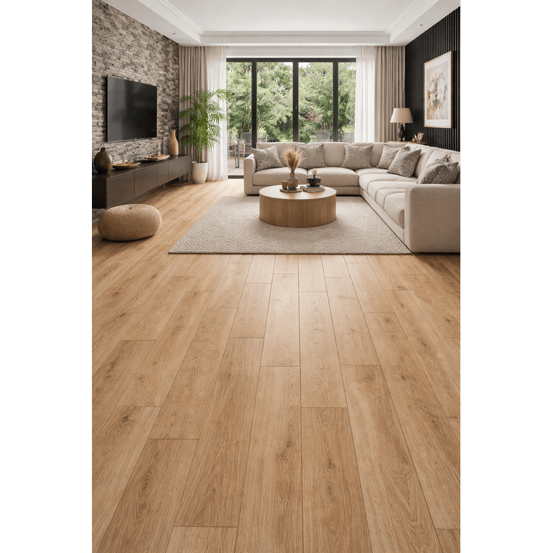 El porcelanato tipo madera Atelier Beige 25x150 cm combina la calidez visual de la madera con la resistencia del porcelanato, ideal para pisos interiores de alto uso residencial. Su formato alargado tipo tablón realza los espacios, aportando continuidad y elegancia, mientras que su acabado mate y variación de tono media generan un efecto natural y equilibrado.