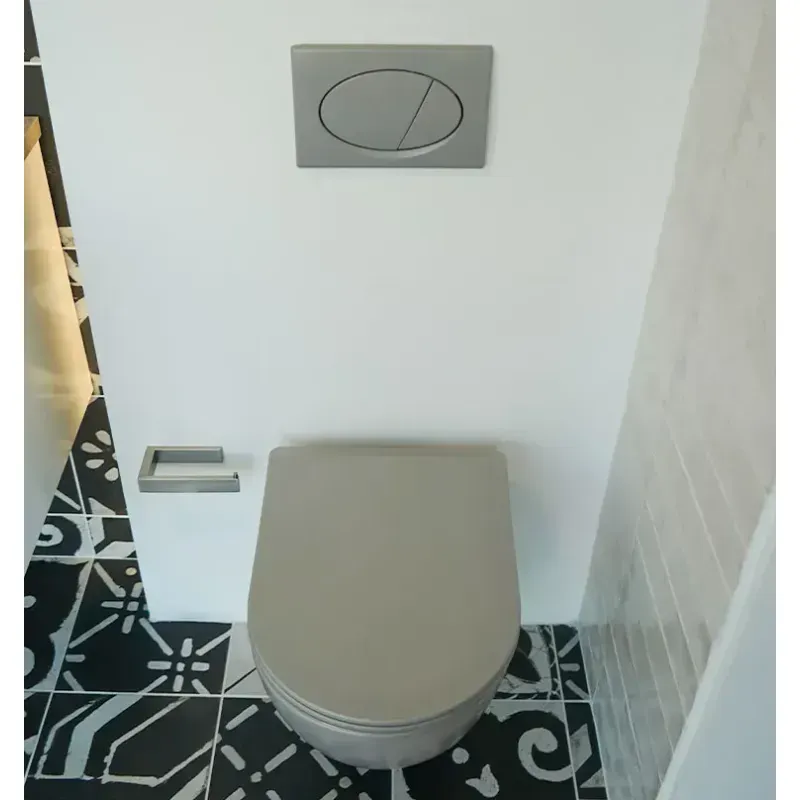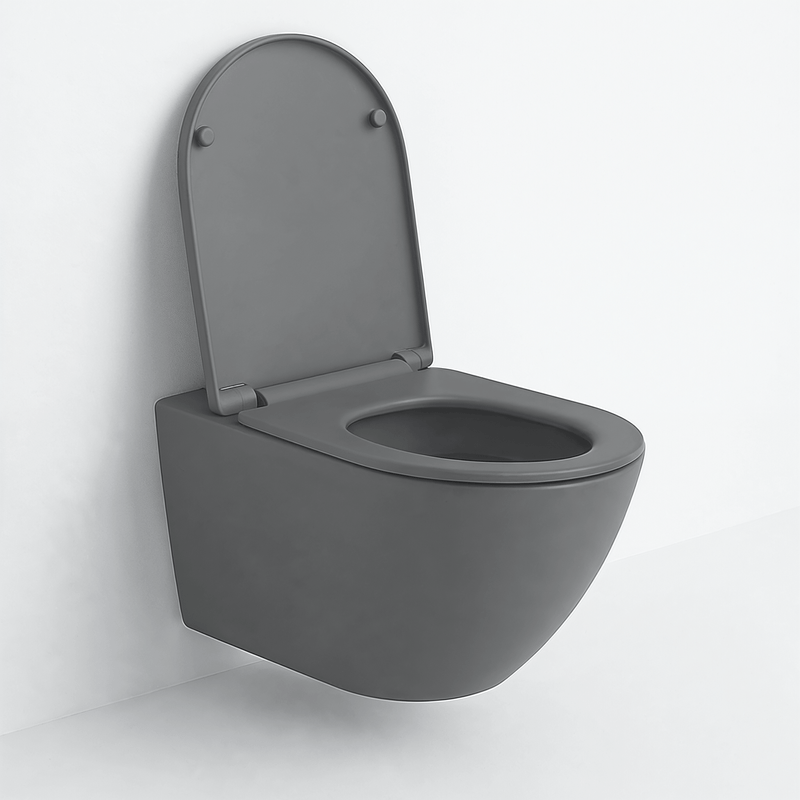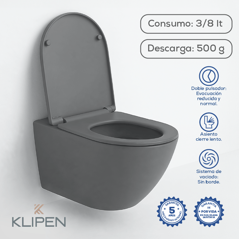 Eleva el diseño de tu baño con el Sanitario Suspendido Eclipse Gris Mate. Este inodoro flotante de estética moderna maximiza el espacio y facilita la limpieza al no tocar el suelo. Incorpora la avanzada tecnología de descarga Rimless, que asegura una limpieza profunda y completa al circular el agua por las paredes internas. Es un sanitario ahorrador gracias a su sistema de doble pulsador con opciones de 3 litros y 8 litros. Fabricado en loza sanitaria vitrificada, incluye un elegante asiento de cierre lento.